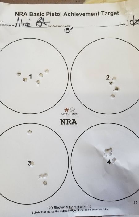 My goal to take this course was because I am not comfortable - in fact more than a bit fearful - of firearms and their use. I am not a gun enthusiast, nor am I necessarily a supporter of the NRA - a point she made very clear at the first sentence of her class: this is about learning about your pistol, and knowing the correct safety, mechanisms, and procedures of how to to use it. The course was designed by the NRA - very well done - but Alice’s personal method of supporting her students and keeping a remarkably safe yet ‘open’ venue made it absolutely the example of how ‘education' should be manifested. Her clear, very specific, organized and closely monitored class was transformational. Hands on, multiple ways of presenting the material, practicing and implementing safe procedures, and working as a team in class was a wonderful and reassuring experience (and such a difference from my police-taught NRA class in an unheated building in February 2016, with no hands on, no interaction, just book work; I think I am still recovering from the frostbite…). This is one course where hands-on is essential to success.